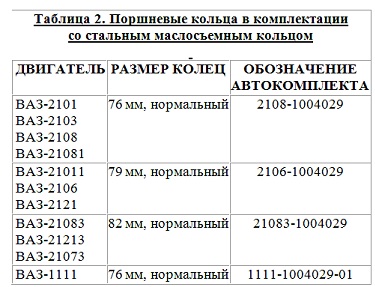 Вся разновидность колец, которые выпускает Волжский автомобильный завод, показана в таблице 1 и 2. В первом столбце таблицы указывается модель двигателя. Во втором - указан диаметр для определенных моделей двигателя и ремонтные размеры для колец. В третьем столбце - обозначение комплекта поршневых колец, которое применяется для любых двигателей данных моделей и обязательно должно быть на упаковке.